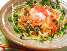| 【3】レンジで1分程温めたうどんを(2)に入れ、野菜と一緒に炒め★とからめながら炒める。 | |